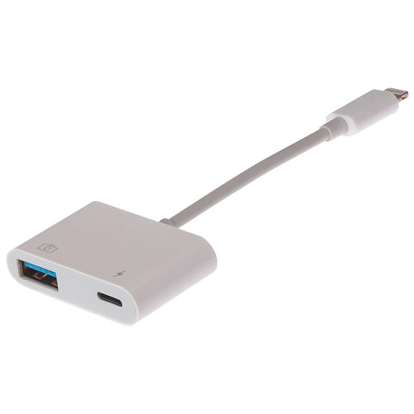 This Maplin Lightning to USB-A / Lightning Charging Port Adapter is perfect for transferring pictures from your camera to your iPhone, iPad or other Lightning device. Simply plug you camera's USB-A cable into the adapter and get ready to download. The camera adapter also has a Lightning Charging Port so you can continue to charge your device while you access images.