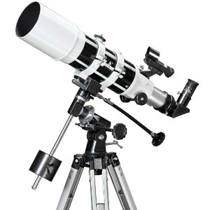Achromatic refractor telescope with a 102mm (4 inch) diameter objective lens. Good telescope for astrophotography and also for daytime terrestrial use. Comes with 10mm and 25mm 1.25" eyepieces, red dot finder, dual fit 1.25"/2" focuser, 1.25" star diagonal and aluminium tripod with accessory tray. Magnifications with supplied eyepieces 20x and 50x. 62.5% more light gathering than an 80mm scope.